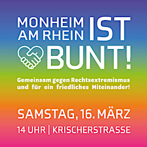 Die demokratischen Parteien und die Glaubensgemeinschaften in Monheim am Rhein rufen dazu auf, am 16. März ab 14 Uhr auf der Krischerstraße ein Zeichen gegen Rechtsextremismus und für ein friedliches Miteinander unabhängig von Herkunft oder Religion zu setzen.